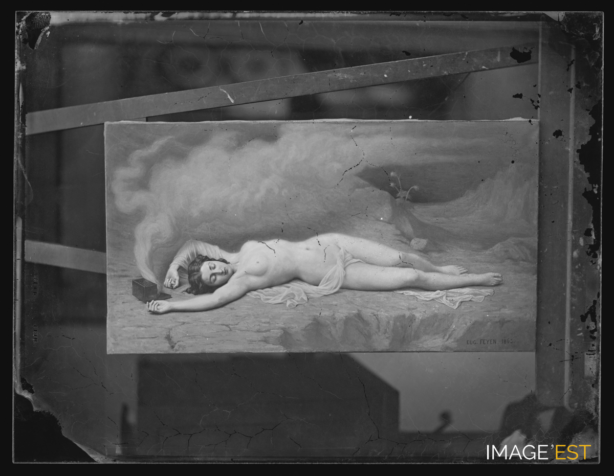 Reproduction d'un tableau d'Eugène Feyen (1815-1908), signé et daté de 1863, probablement une représentation de Pandore. Le tableau est installé sur un chevalet. Photographie sur plaque de verre au collodion attribuée au peintre Eugène Feyen (1815-1908), né à Bey-sur-Seille (Meurthe).