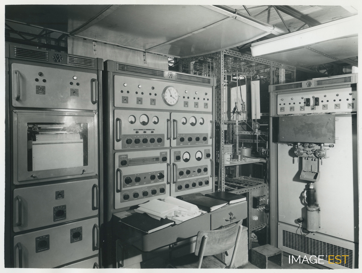 Laboratoire de l'École nationale supérieure des industries chimiques (ENSIC) à Nancy (Meurthe-et-Moselle). Cachet du photographe " Charles André Nancy ". Une mention manuscrite au dos précise : " Tableur de commande d'un spectromètre de masse ".