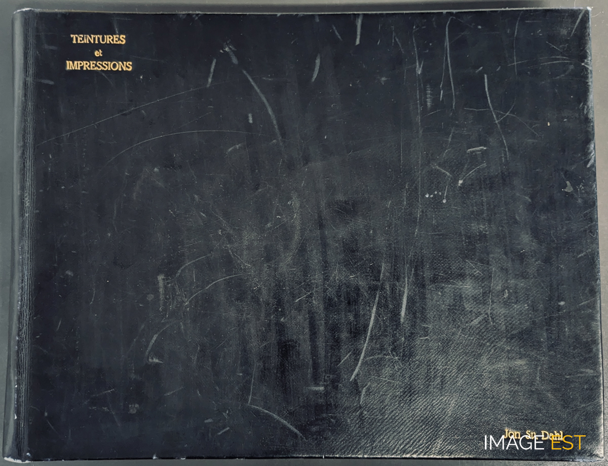 Couverture d'un album de couleur noir (26 x 34,5 cm), intitulé : " Teintures - Impressions, Jon Sv. Dahl ", et issu des collections de l'École nationale supérieure des industries chimiques (ENSIC) à Nancy (Meurthe-et-Moselle). Cet album comprend trois chapitres : 1. " Laines, cotons " avec des portraits caricaturés de professeurs (Courtot, Travers, Cornubert, Urion) et d'autres compositions ; 2. " Soies " (silouhettes féminines en robe de soirée) ; 3. " Impressions " (morceaux de tapisseries en couleurs).