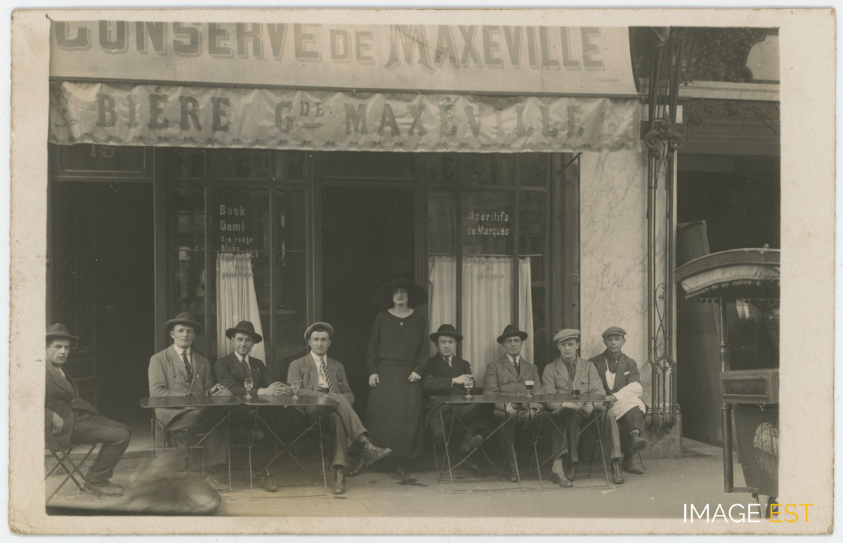 Huit hommes assis et une femme debout à la terrasse d'une brasserie servant de la bière des Grandes Brasseries de Maxéville.