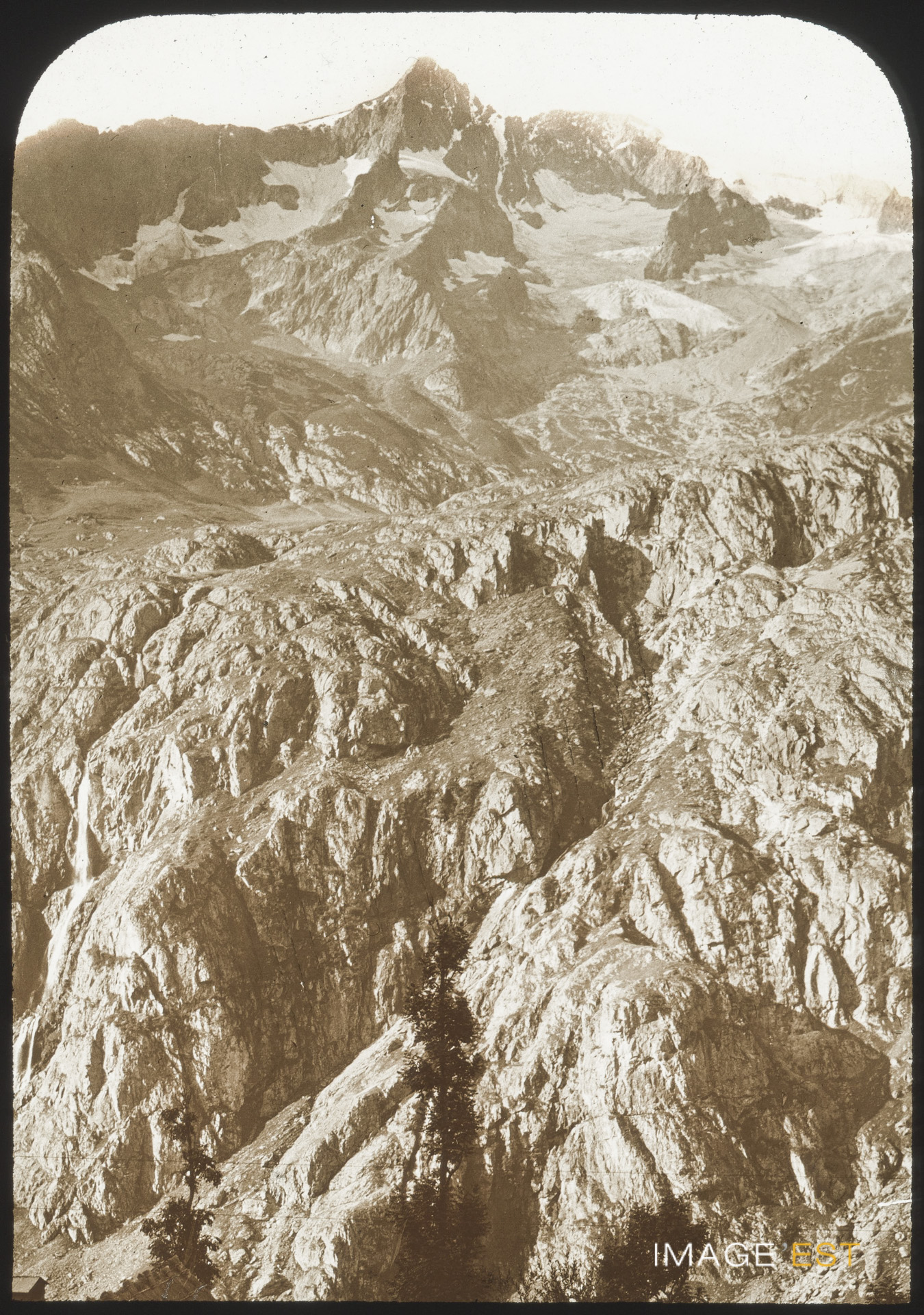 Tête de Lauranoure à Saint-Christophe-en-Oisans (Isère). Une mention manuscrite en marge de la plaque de verre indique : " La tête de Lauranoure (3341m) depuis St Christophe. "