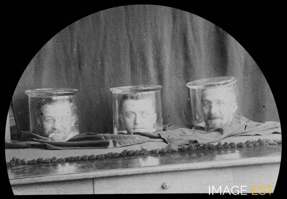 Louis Spillmann (1875-1940) au centre, entouré de ses amis, étudiants en médecine à Nancy (Meurthe-et-Moselle) vers 1900. Leurs têtes apparaissent dans des bocaux en verre comme si elles avaient été disposées ainsi, une manière de tourner en dérision la médecine. Louis Spillmann adhère à la Société lorraine de photographie (1894-1914) en juin 1894 et en sera un membre très actif. À gauche, tenant une cigarette entre les lèvres, peut-être Lucien Nilus (1875-19..). Voir aussi le catalogue de l'exposition " Pionniers. La Société lorraine de photographie et de cinématographie, 1894-1983 " , 2024, p.94-95).