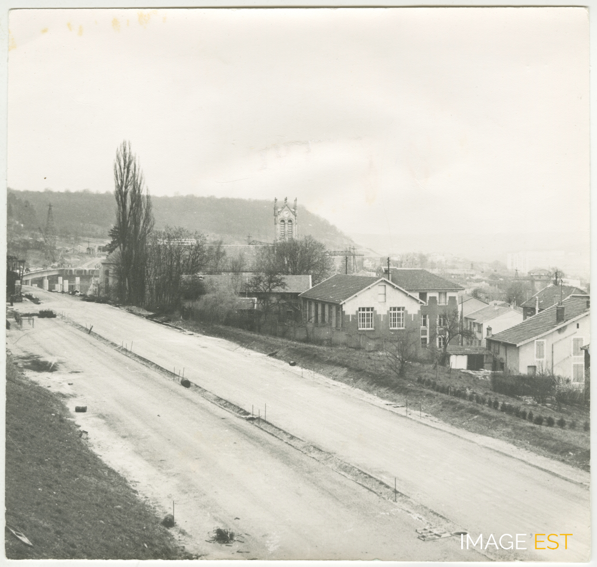 Travaux de terrassement de la bretelle d'accès à l'autoroute A31 à Maxéville (Meurthe-et-Moselle). Au verso, une annotation précise : " Photo club de Maxéville ".