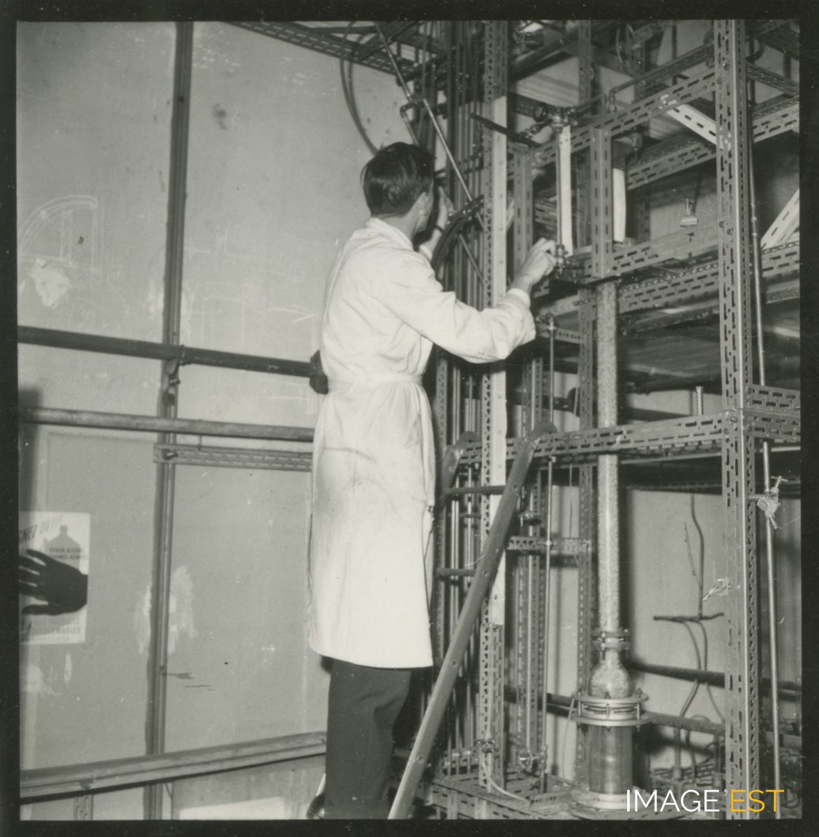 Travaux pratiques à l'École nationale supérieure des industries chimiques (ENSIC) à Nancy (Meurthe-et-Moselle). Une mention manuscrite au verso de ce document précise : " Extractions liquides ".
