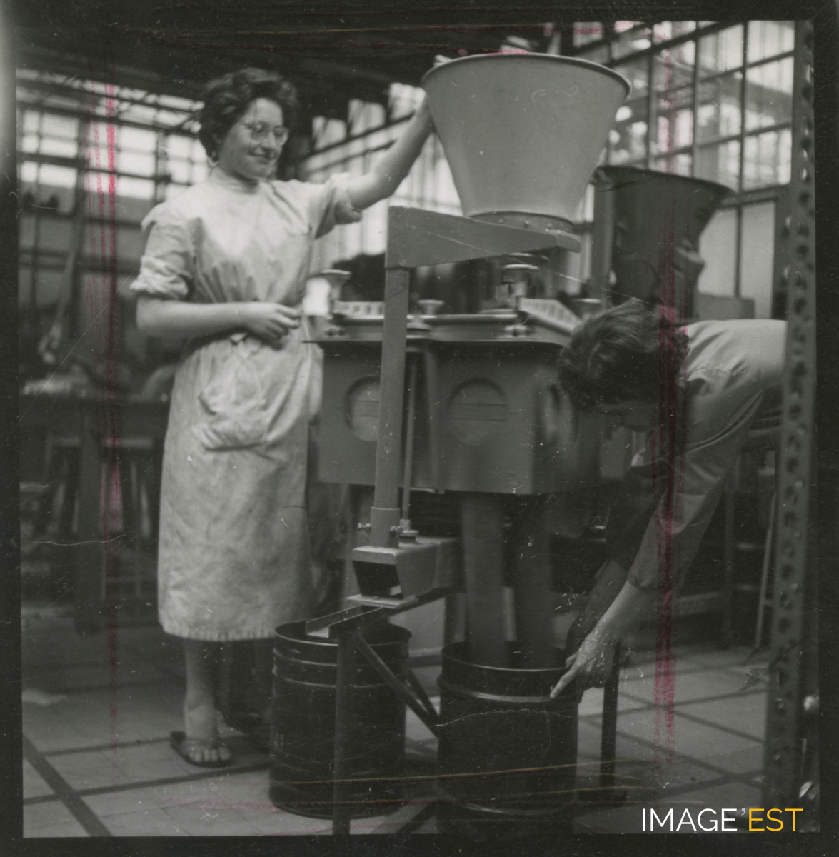 Travaux pratiques à l'École nationale supérieure des industries chimiques (ENSIC) à Nancy (Meurthe-et-Moselle). Une mention manuscrite au verso de ce document précise : " Broyage et tamisage 75 ".