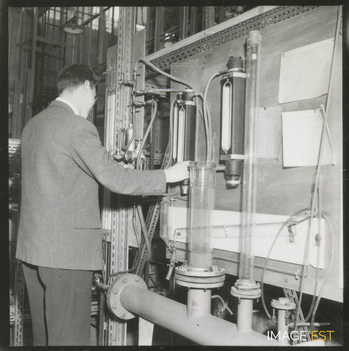 Travaux pratiques à l'École nationale supérieure des industries chimiques (ENSIC) à Nancy (Meurthe-et-Moselle). Une mention manuscrite au verso de ce document précise : " Fluidisation ".