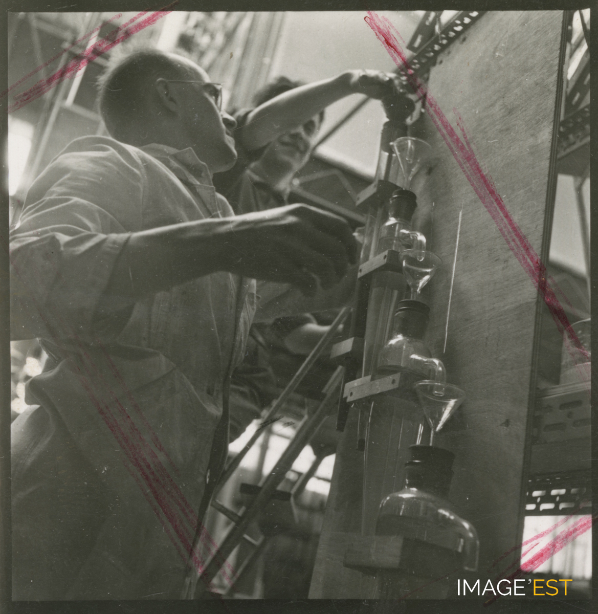 Travaux pratiques à l'École nationale supérieure des industries chimiques (ENSIC) à Nancy (Meurthe-et-Moselle). Une mention manuscrite au verso de ce document précise : " Fluidisation 100 cm ".