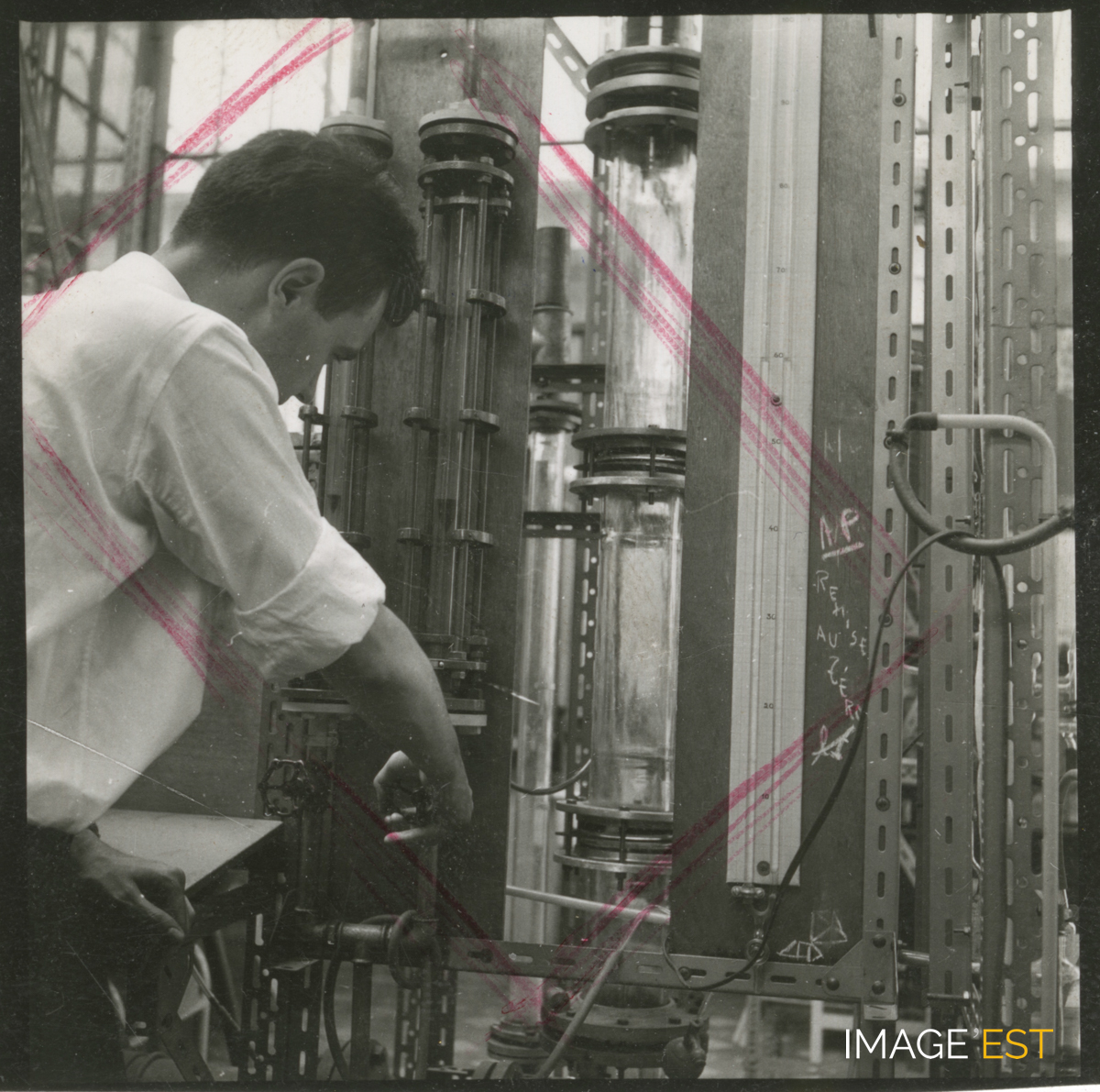 Travaux pratiques à l'École nationale supérieure des industries chimiques (ENSIC) à Nancy (Meurthe-et-Moselle). Une mention manuscrite au verso de ce document précise : " Absorption 100 cm ".