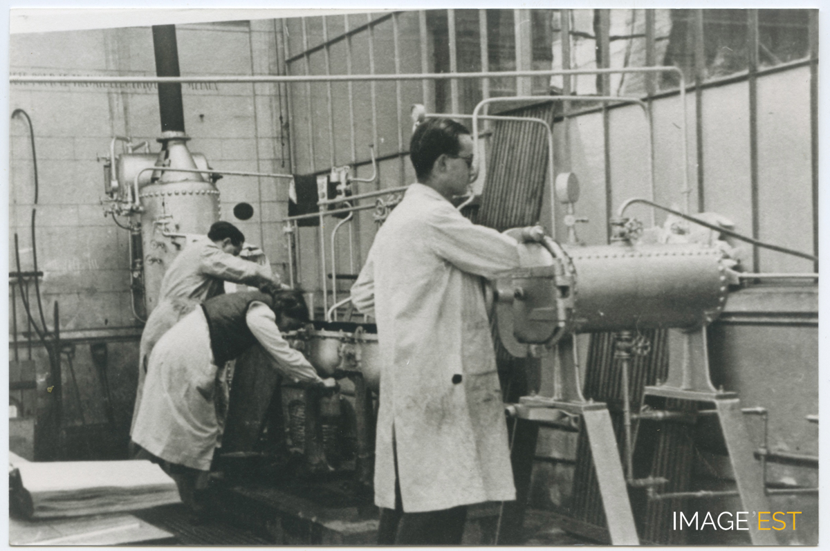 Travaux pratiques à l'École nationale supérieure des industries chimiques (ENSIC) à Nancy (Meurthe-et-Moselle). Une mention manuscrite au verso de ce document précise : " Promo 1949 - De gauche à droite, ?, Mlle Juzans (Mme Figuères), promo 1949 ; F. Collart, promo 1947 ".