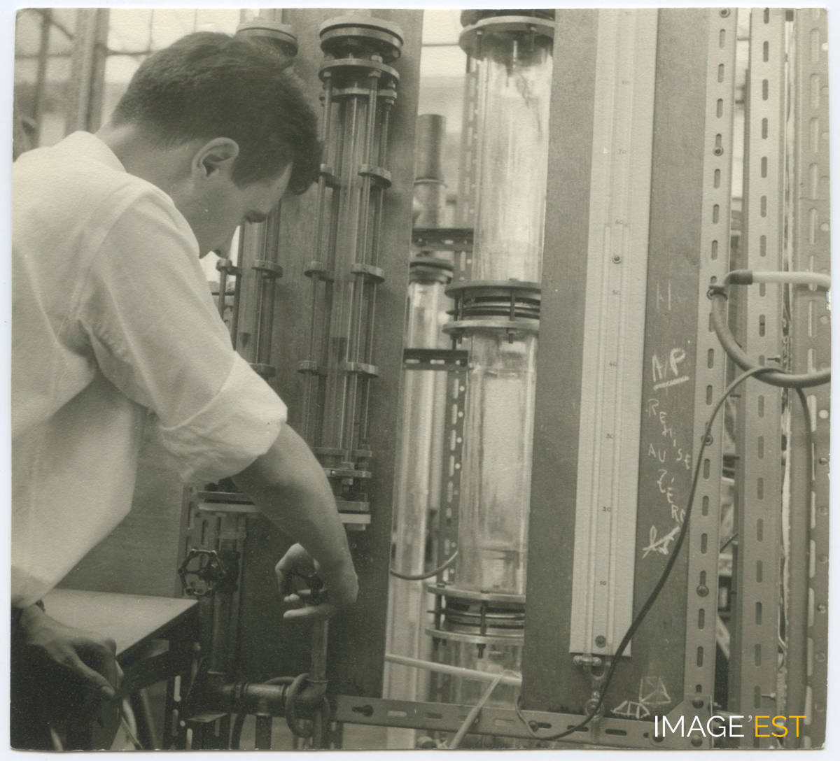 Travaux pratiques à l'École nationale supérieure des industries chimiques (ENSIC) à Nancy (Meurthe-et-Moselle). Une mention manuscrite au verso de ce document précise : " Réglage du débit sur la colonne d'absorption ".