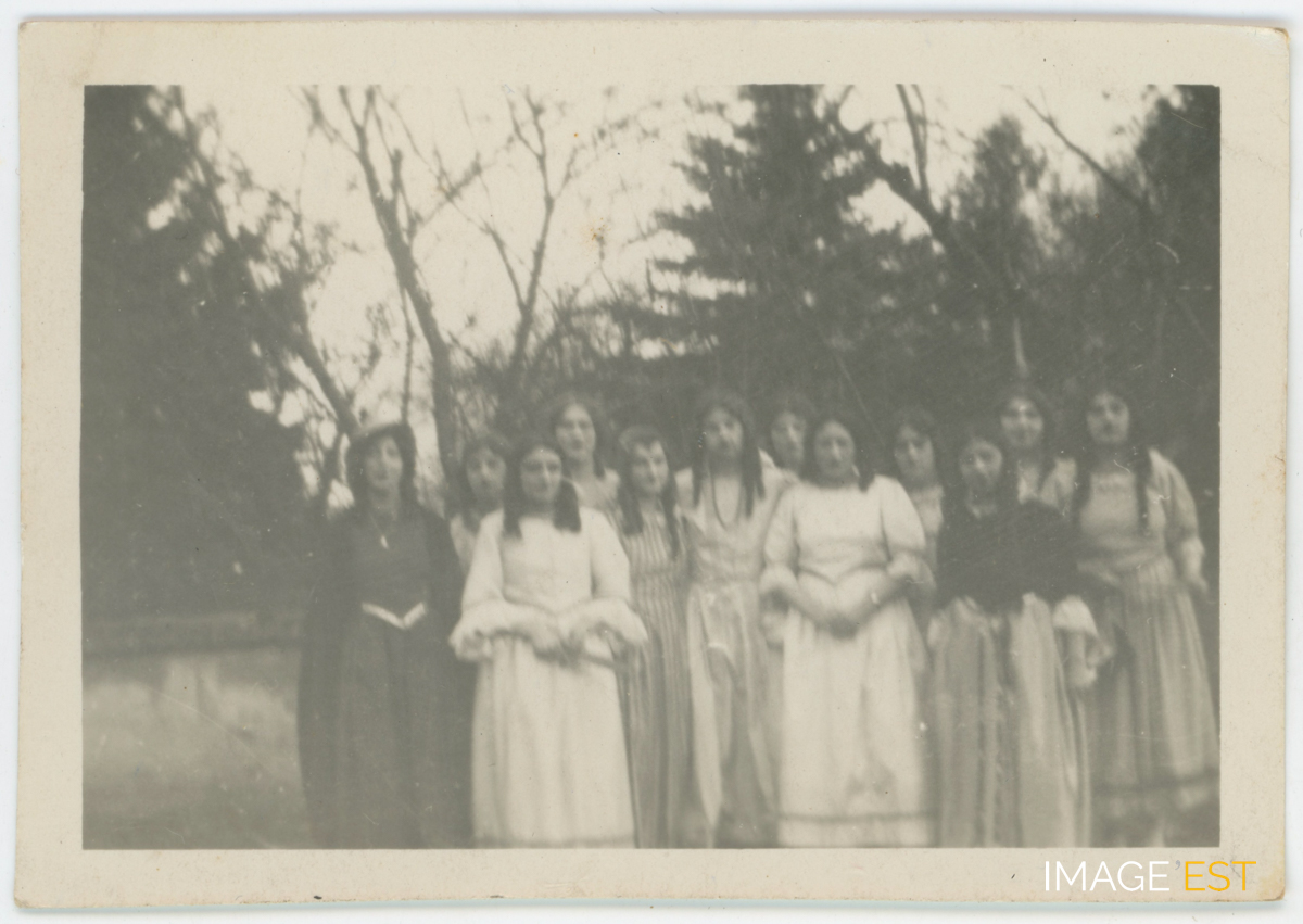 Groupe de jeunes filles en costume de théâtre dans le jardin de la maison des Oeuvres à Maxéville (Meurthe-et-Moselle).