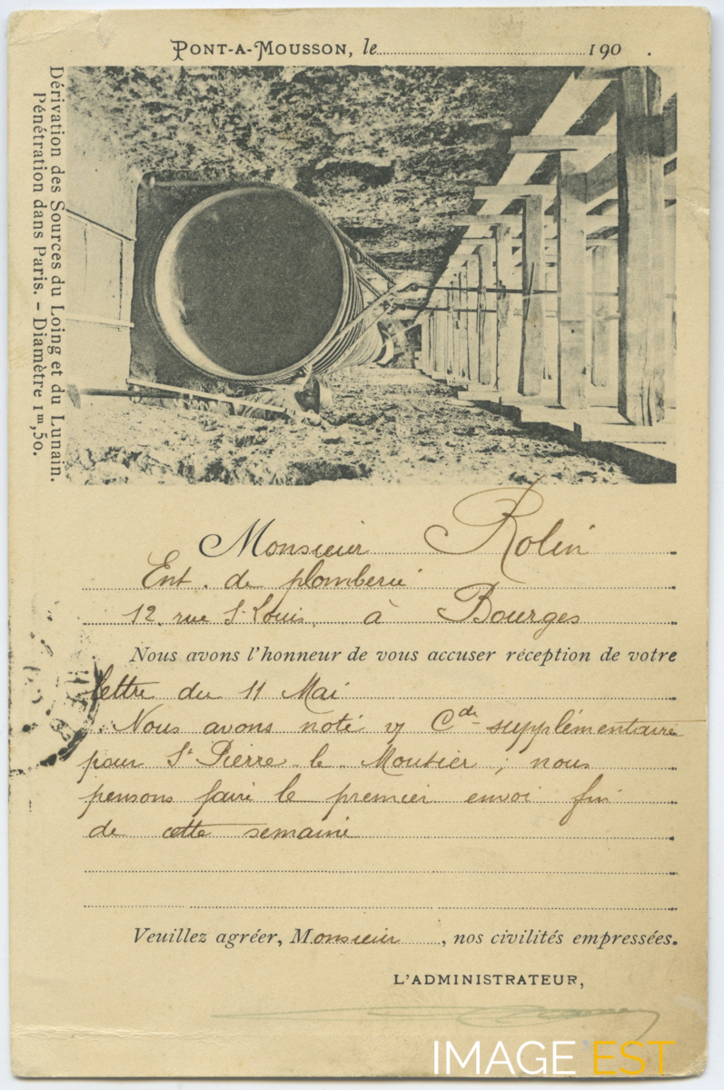 Pose d'un tuyau de dérivation par la " Société anonyme des hauts fourneaux et fonderies de Pont-à-Mousson " à Pont-à-Mousson (Meurth-et-Moselle) pour les sources du Loing et du Lunain dans le cadre d'un chantier de canalisation de la ville de Paris à la fin du XIXe siècle. Le site des Archives Saint-Gobain apporte les précisions techniques et historiques suivantes sur ce chantier : " Entre 1878 et 1893, 80 % des 85 000 tonnes de tuyaux et pièces de raccords mis en oeuvre par la Ville de Paris ont été fabriqués par l'usine lorraine " (https://archives.saint-gobain.com/ressource/xixe/1883/la-canalisation-generale-de-paris). Cette carte postale est adressée à M. Rolin, entrepreneur de plomberie à Bourges.