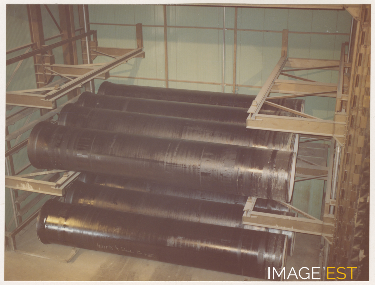 Tuyaux stockés au sein de l'usine de Pont-à-Mousson (Meurthe et Moselle) le 20 février 1976.