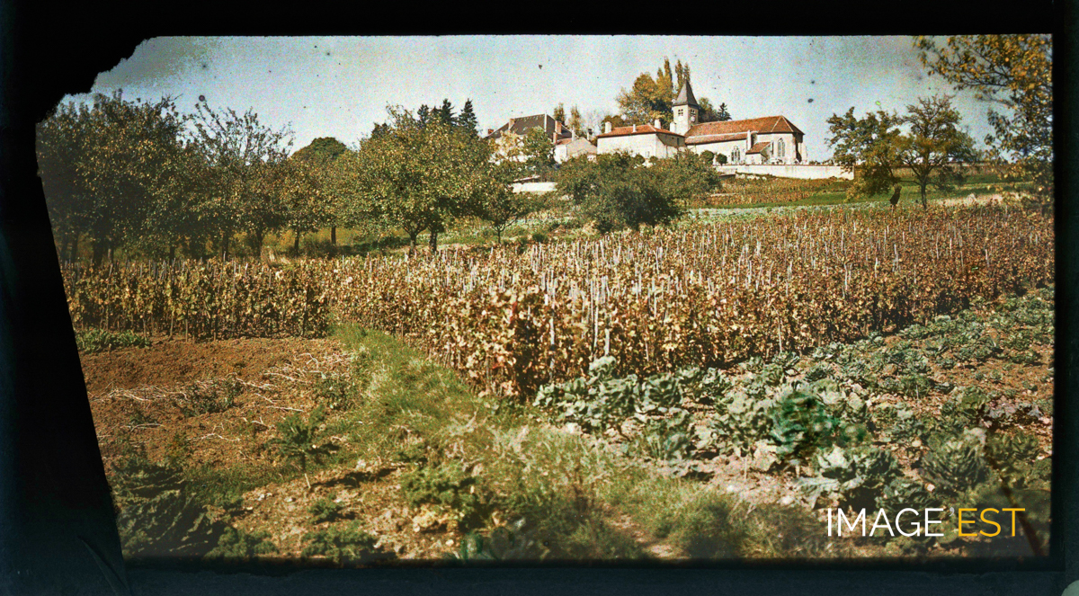 Vue sur un potager et un verger au second plan à Essey-lès-Nancy (Meurthe-et-Moselle) derrière l'église Saint-Georges et son cimetière. Aucune mention manuscrite en marge de la plaque de verre autochrome.
