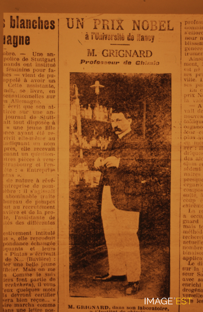 Article de presse paru dans le journal L'Est républicain à l'occasion du prix Nobel de chimie décerné en 1912 à M. Grignard (1871-1935), professeur de chimie à l'Institut chimique de Nancy (Meurthe-et-Moselle).