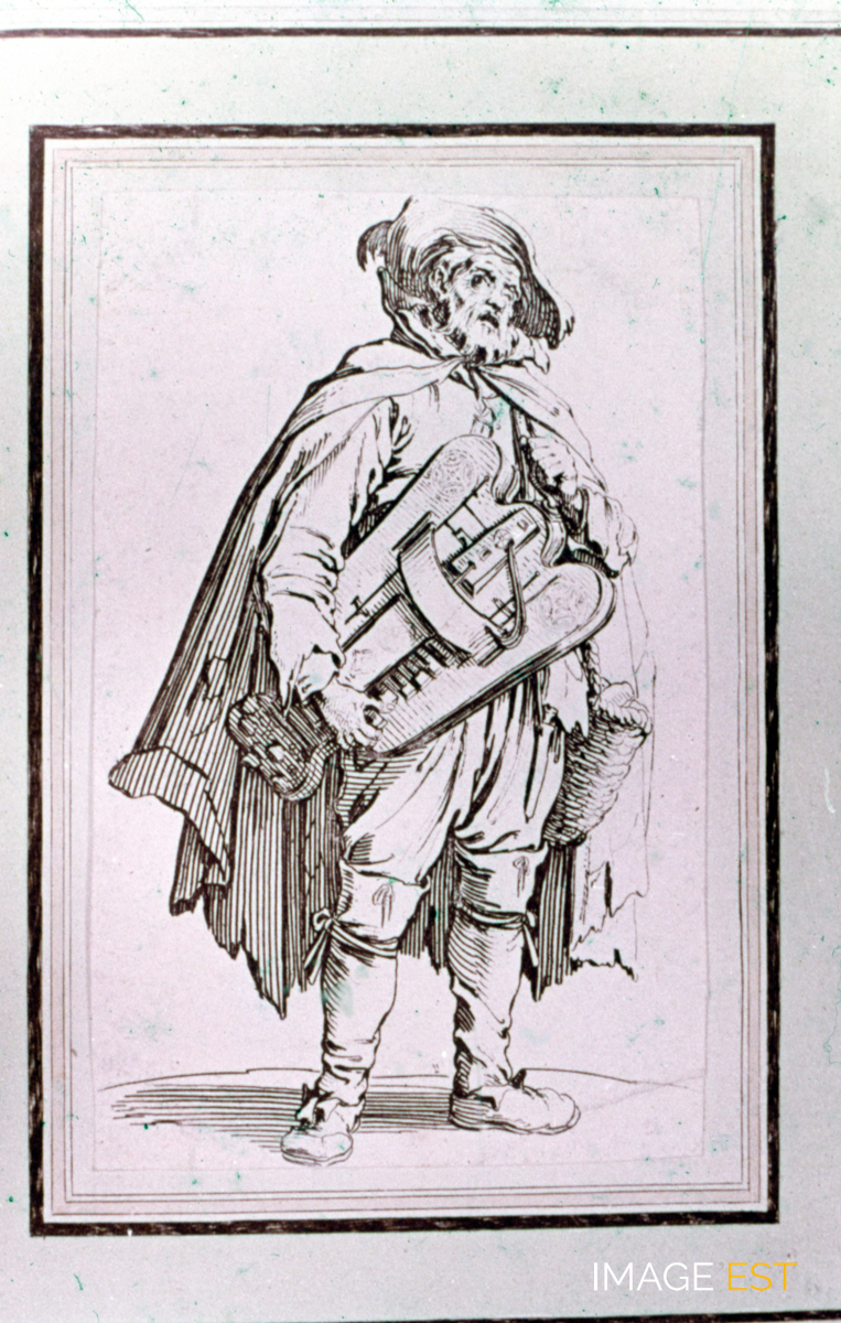 Jacques Callot (1593-1635), témoin de son temps (2e série). Estampe de Jacques Callot (1619 1628) représentant un mendiant joueur de vielle, fort nombreux après les guerres dans le duché. En marge de la diapositive figure la mention : " 6. Les Gueux : un vielleur (1622) ". Séries de diapositives sélectionnées et commentées par Jean Hurstel, directeur du Service éducatif des Musées de l'Académie de Nancy-Metz.