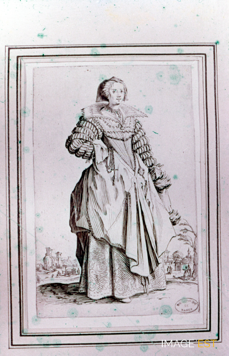 Jacques Callot (1593-1635), témoin de son temps (2e série). Eau forte de Jacques Callot (1619 1628) représentant une dame très élégante, précieux témoignage de la mode de l'époque. En marge de la diapositive figure la mention : " 5. Les Bourgeois nobles : une dame (1624) ". Séries de diapositives sélectionnées et commentées par Jean Hurstel, directeur du Service éducatif des Musées de l'Académie de Nancy-Metz.
