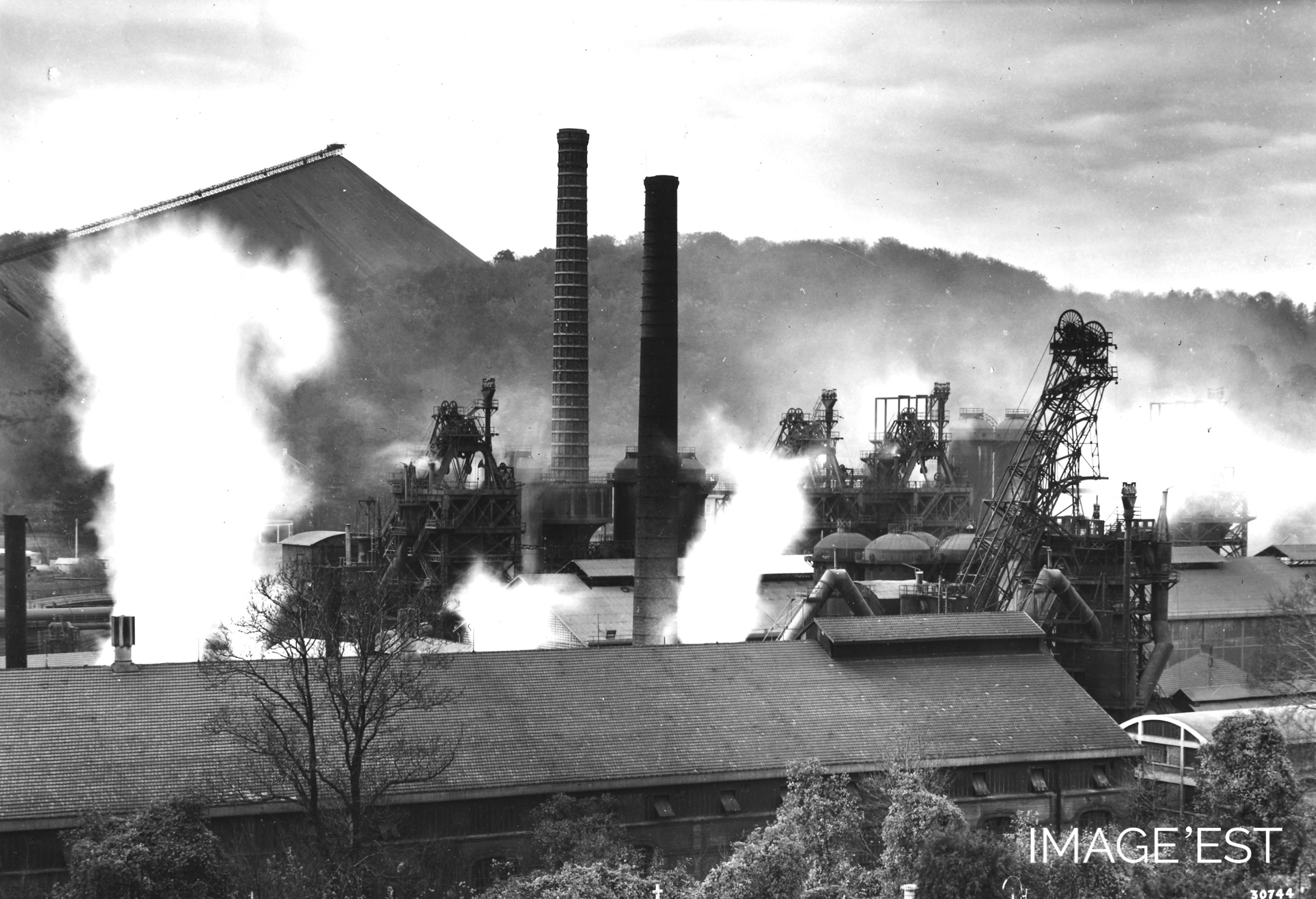 Le crassier, les hauts fourneaux et les halles de coulée de l'usine sidérurgique de la Providence de Réhon (Meurthe-et-Moselle) en 1953.