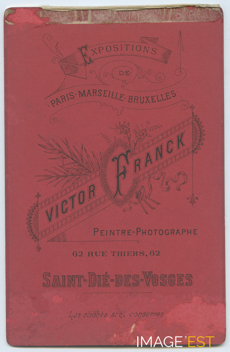 Portrait-carte de visite du peintre et photographe Victor Franck, installé 62, rue Thiers à Saint-Dié-des-Vosges (Vosges). Cette photographie est extraite d'un album contenant des portraits de nombreux prêtres ayant exercés dans le département des Vosges entre 1870 et 1910 environ. La Maison Victor Franck, établissement photographique, a été fondée en 1848 à Saint-Dié-des-Vosges (Vosges). Victor Franck père (1822-1879), photographe installé à Saint-Dié, membre actif de la Société Lorraine de Photographie (1894-1914), est l'auteur de nombreuses photographies illustrant notamment la vie rurale et le monde forestier dans le département des Vosges à la fin du XIXe siècle.