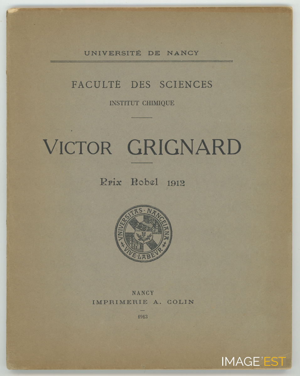 Brochure intitulée " Victor Grignard - Prix Nobel 1912 " consacrée François Auguste Victor Grignard (1871-1935), chimiste français, lauréat avec Paul Sabatier du prix Nobel de chimie en 1912 et professeur à l'Institut chimique de Nancy de 1909 à 1918. Une seule illustration montre le professeur dans son laboratoire (cf. aussi FI-1245-0290). Le 12 novembre 1912, le prix Nobel, pour la chimie, était attribué à deux savants français, Paul Sabatier (Université de Toulouse) et Victor Grignard (Université de Nancy). Le 10 décembre, ils se rendirent à Stockholm pour y recevoir leur diplôme. Les insignes de chevalier de Légion d'honneur furent remis officiellement à Victor Grignard par le recteur de l'Université de Nancy dans le Grand Amphithéâtre de la Faculté des Sciences, le 8 février 1913. Un bronze d'art lui fut offert aisni qu'un " croix en brillants " par l'Association des Anciens Élèves de l'Institut chimique de l'Université de Nancy. La brochure comprend le discours de M. Charles Adam, correspondant de l'Institut de France, recteur de l'Université de Nancy, le discours de M. Floquet, doyen de la Faculté des Sciences, le discours de M. Michel, ingénieur-chimiste, président l'Association des Anciens Élèves de l'Institut chimique de Nancy et le discours de M. Grignard.
