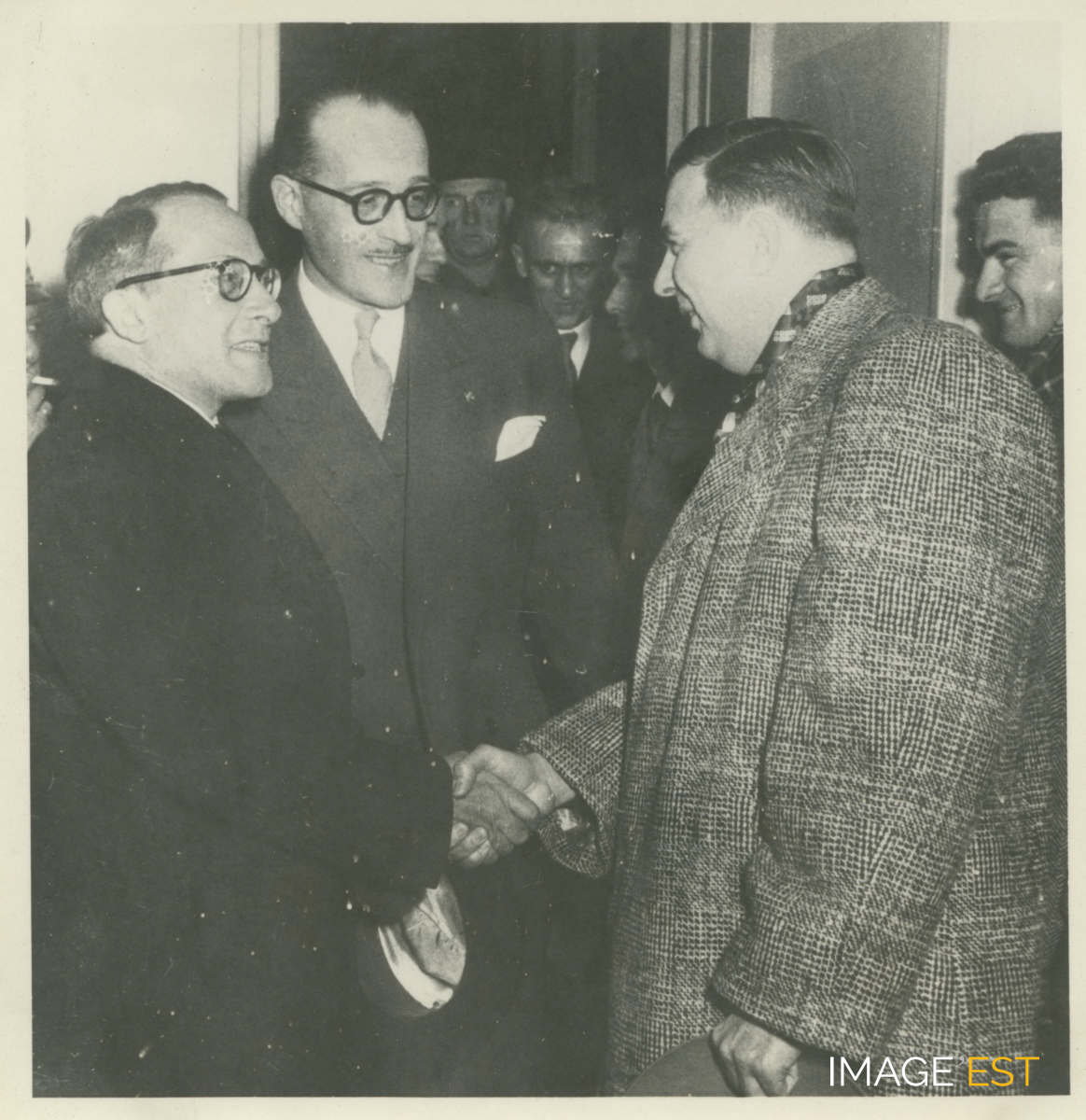 Visite de nouveaux locax en présence de Maurice Letort (1907-1972), professeur à la Faculté des sciences de Nancy et directeur de l'École nationale supérieure des industries chimiques de Nancy (ENSIC) de 1946-1956 (Source : https://cths.fr/an/savant.php?id=112672#). Ce cliché est extrait d'un album en cuir, format à l'italienne (16 x 23 cm).