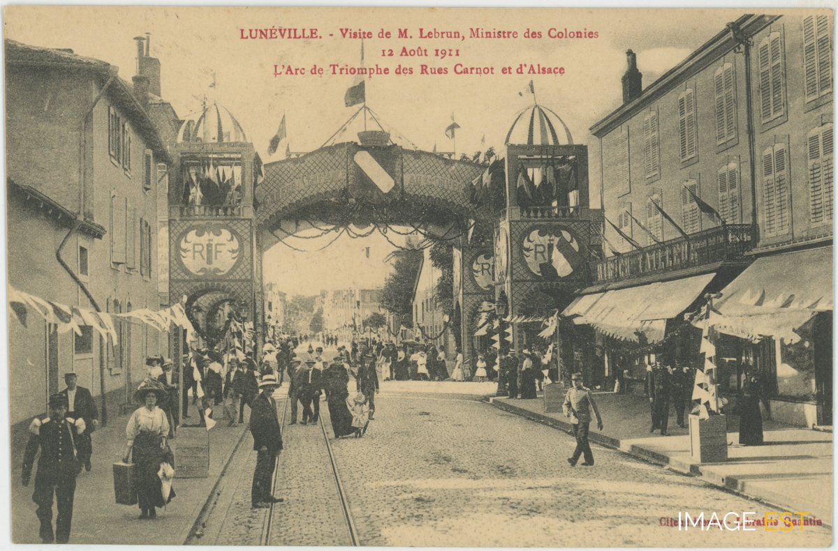 Arc de triomphe érigé rues Carnot et d'Alsace à Lunéville (Meurthe-et-Moselle) lors de la visite de M. Lebrun, ministre des Colonies, le 12 août 1911.
