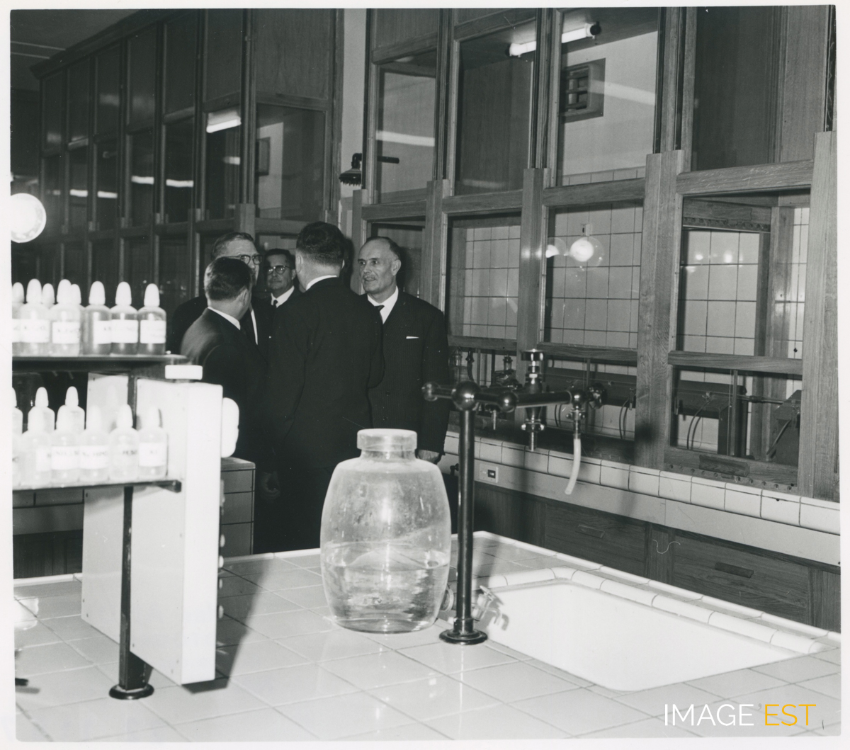 Visite des nouveaux locaux de l'École nationale supérieure des industries chimiques (ENSIC) rue Déglin à Nancy (Meurthe-et-Moselle). Cachet du photographe Charles André (N°22-1167) au verso.