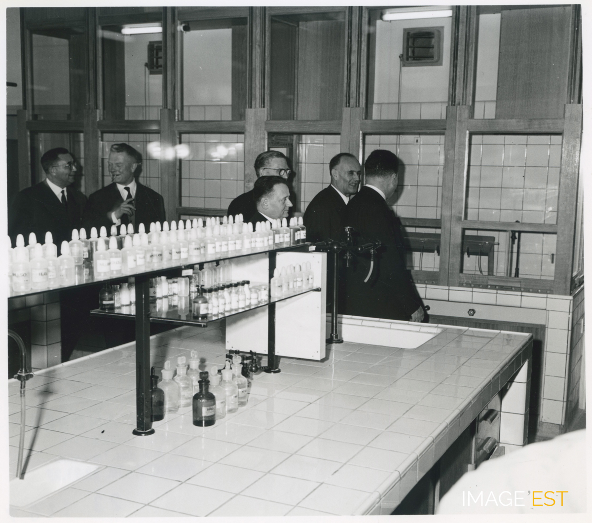 Visite des nouveaux locaux de l'École nationale supérieure des industries chimiques (ENSIC) rue Déglin à Nancy (Meurthe-et-Moselle). Cachet du photographe Charles André (N°23-1167) au verso.