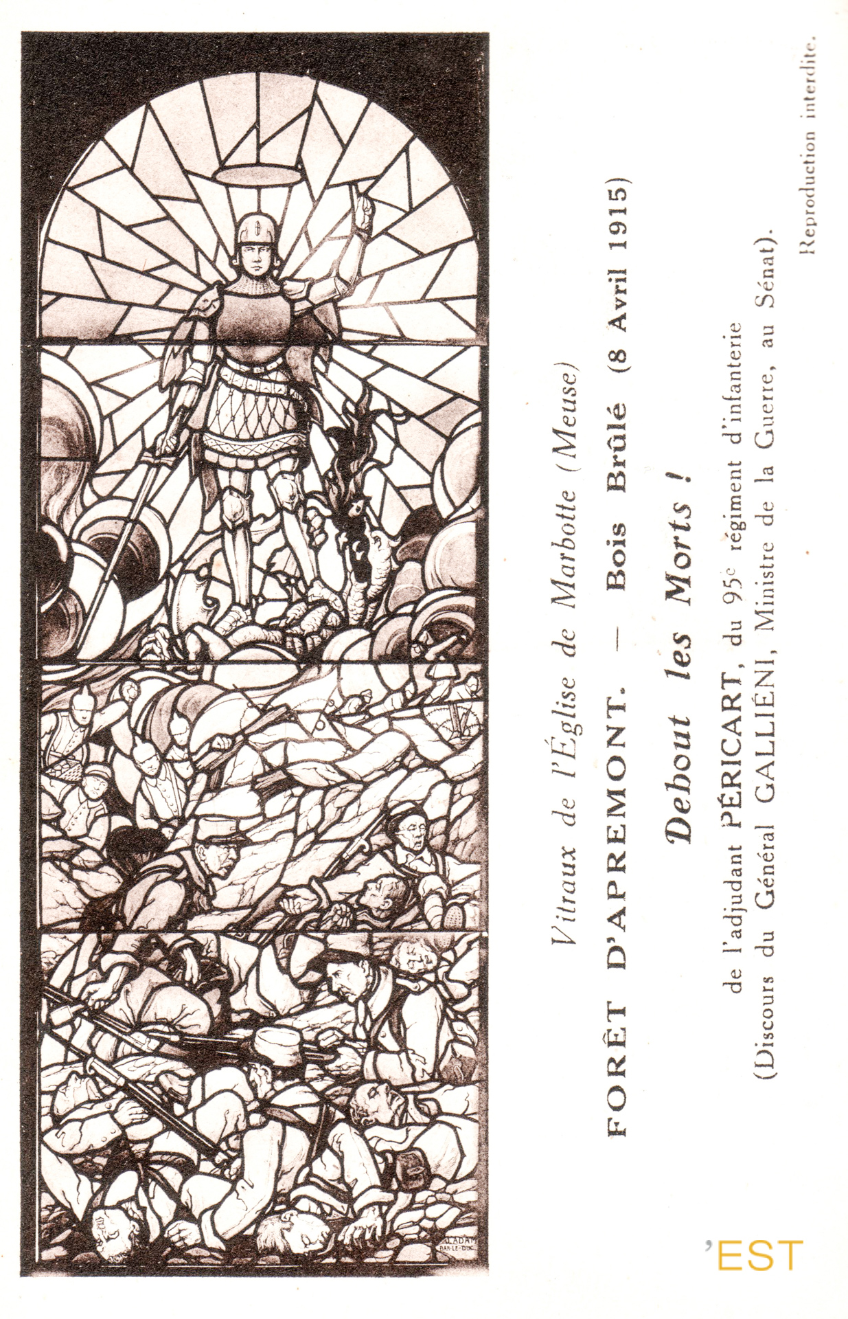 "Représentation d'un vitrail de l'église de Marbotte (Meuse). Dans cet édifice, plusieurs vitraux rendent hommage aux durs combats du saillant de Saint-Mihiel durant la Première Guerre mondiale et plus précisément à ceux de la Forêt d'Apremont et du bois d'Ailly. La légende originale de cette carte postale ajoute les précisions suivantes : " Forêt d'Apremont. - Bois Brûlé (8 avril 1915). Debout les Morts ! de l'adjudant Africart, du 95e régiment d'infanterie (Discours du général Gallieni, ministre de la Guerre, au Sénat) "."