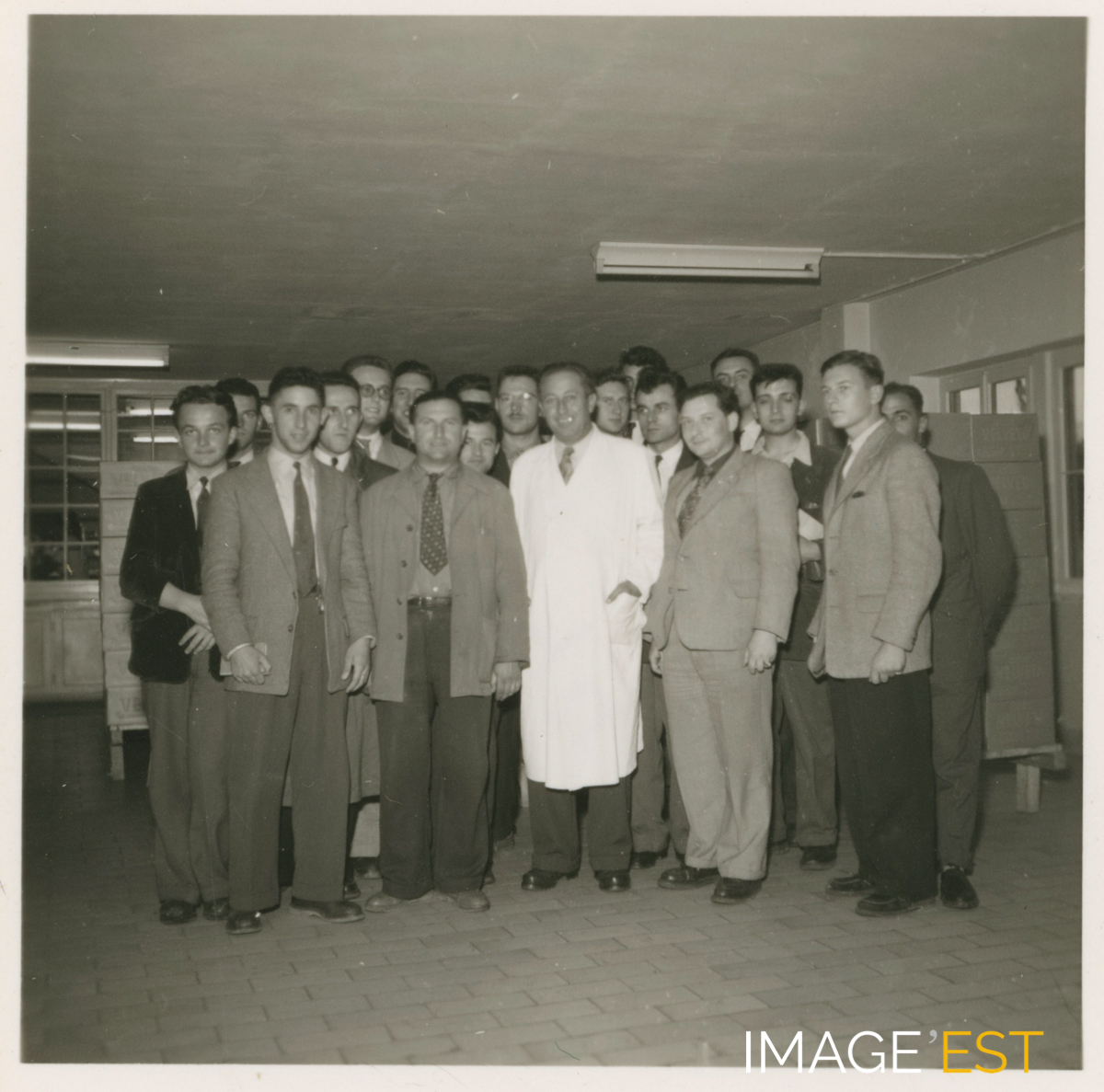 Voyage d'études d'une promotion d'étudiants de l'Ensaia (École nationale supérieure d'agronomie et des industries alimentaires) probablement en Allemagne. Une mention manuscrite au verso précise : " Voyage d'études 1952-1953 ". Cachet du photographe " Foto " Bas " Lindenberg/Allg. "