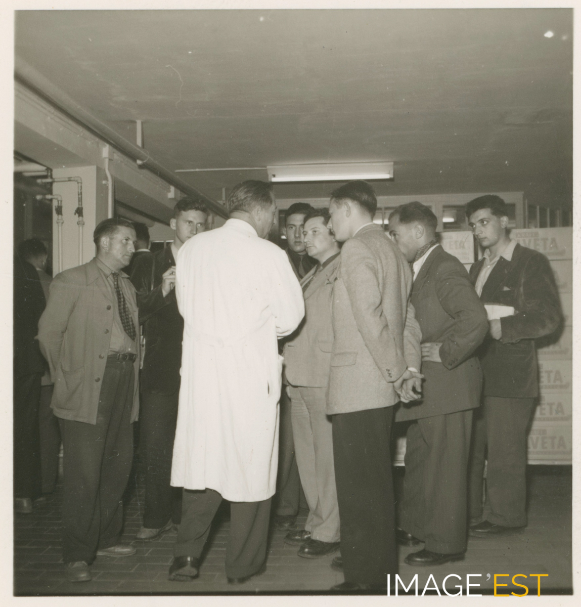 Voyage d'études d'une promotion d'étudiants de l'Ensaia (École nationale supérieure d'agronomie et des industries alimentaires) probablement en Allemagne. Une mention manuscrite au verso précise : " Voyage d'études 1952-1953 ". Cachet du photographe " Foto " Bas " Lindenberg/Allg. "