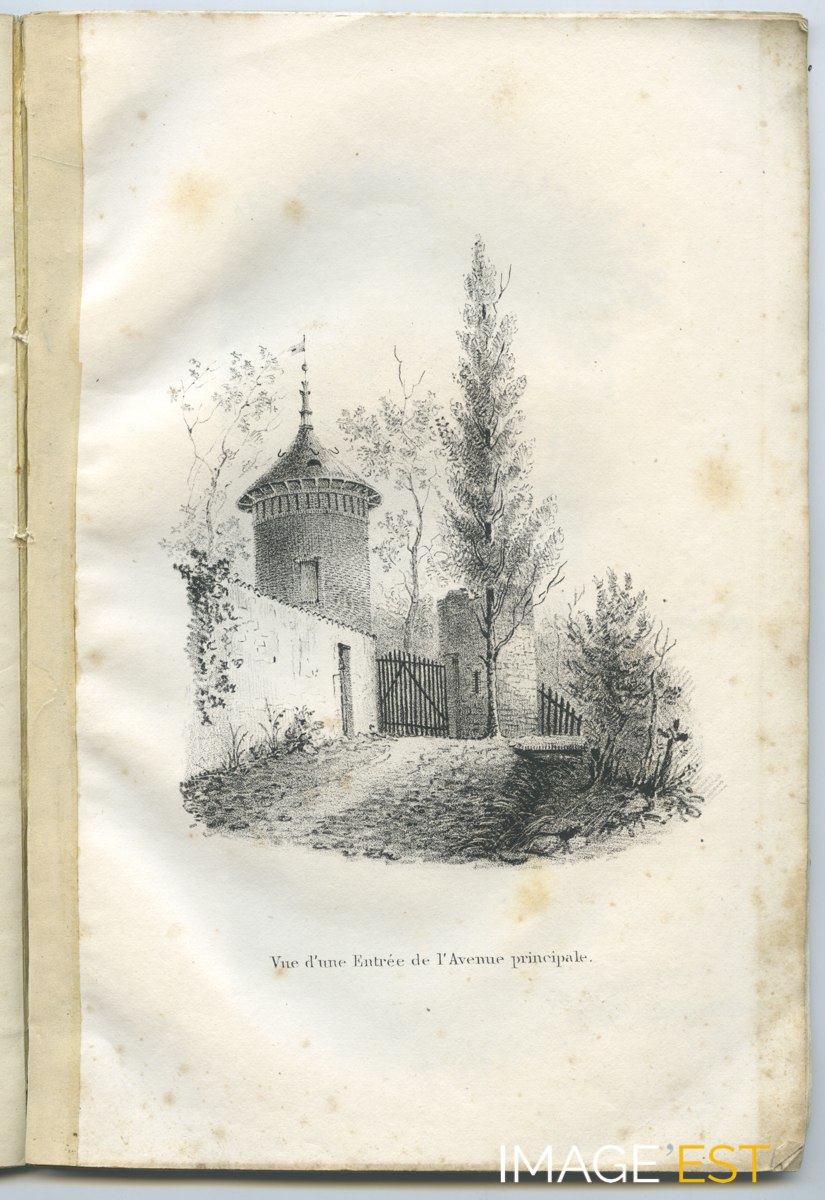 Illustration légendée " Vue d'une entrée de l'Avenue principale " extraite d'une brochure intitulée " Fragments d'une habitation de la ville et de campagne près de Nancy " à Nancy (Meurthe-et-Moselle). Cette brochure comprend un avis de location d'une " jolie Maison de campagne de Sainte-Marie, à une demi-lieue de Nancy ". Il s'agit de l'ancienne propriété du parc Sainte-Marie couvrant 10 hectares, partagés prairies, bois, terres arables, jardins à l'anglaise, etc. La maison principale contenait " dix lits de maîtres, sept lits de domestiques, services de table, cristaux, procelaines, batterie de cuisine, etc." et disposait également d'écuries et d'un chenil.