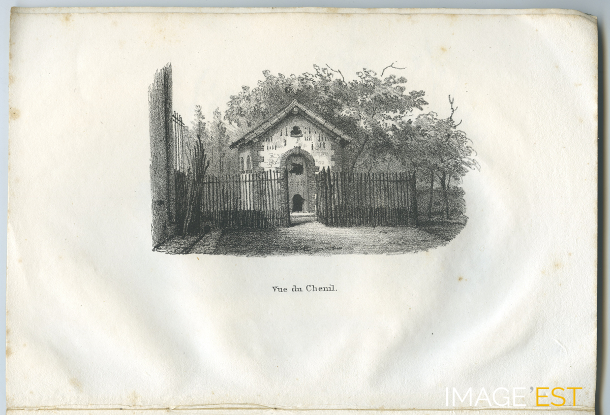 Illustration légendée " Vue du chenil " extraite d'une brochure intitulée " Fragments d'une habitation de la ville et de campagne près de Nancy " à Nancy (Meurthe-et-Moselle). Cette brochure comprend un avis de location d'une " jolie Maison de campagne de Sainte-Marie, à une demi-lieue de Nancy ". Il s'agit de l'ancienne propriété du parc Sainte-Marie couvrant 10 hectares, partagés prairies, bois, terres arables, jardins à l'anglaise, etc. La maison principale contenait " dix lits de maîtres, sept lits de domestiques, services de table, cristaux, procelaines, batterie de cuisine, etc." et disposait également d'écuries et d'un chenil.